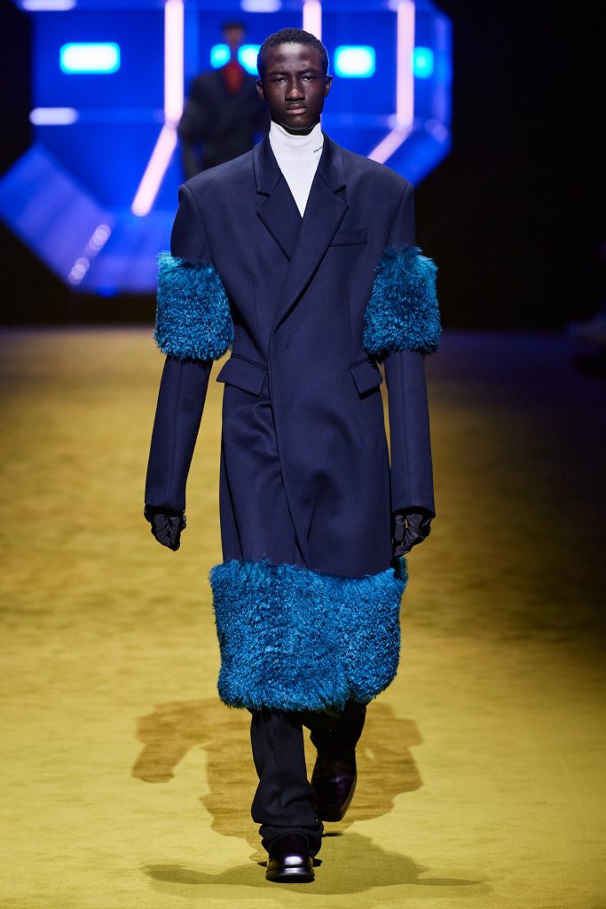 As Prada said in a pre-written note released after the show: ‘We were thinking about meaningful fashion, pieces that make sense. Clothes that make people feel important.’ Leather gloves, turtle necks and matrix bombers were seen as well as furry over-sized coats and chisel toe shoes. Models walked out of a blue led tunnel, giving leisure and futuristic vibes while presenting a form of modern workwear. The live show was full of black clothing and it was closed by Jeff Goldblum.